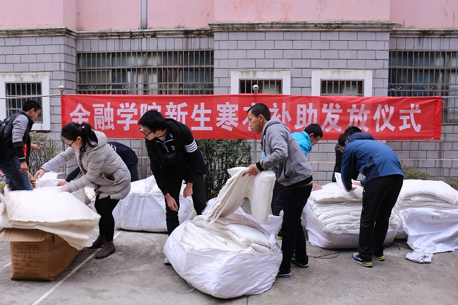 为进一步做好家庭经济困难学生资助工作,我院于12月15日在金融大院举办了寒衣补助发放仪式,给每一位建档新生发放棉衣及垫棉,使贫困学子在天气乍寒之际,及时穿上了御寒的冬装。