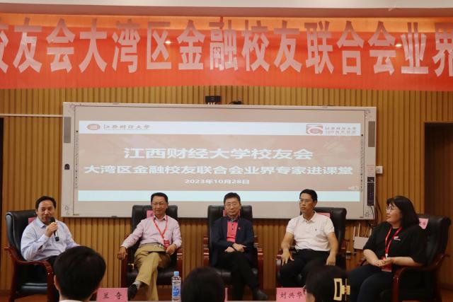 10月28日下午,江西财经大学校友会大湾区金融校友联合会业界专家进课堂活动在翼轸楼报告厅举行,金融学院院长桂荷发,80级金融专业校友、原通联支付网络服务股份有限公司执行总裁兰奇,83级基信专业校友、原建信理财有限责任公司党委书记、董事长刘兴华,88级计划专业校友、中国民生银行华南区域首席审计官李霏,94级投资专业校友、深圳市前海嘉捷投资有限公司创始人、董事长王杰梅和百余名学生参加活动。