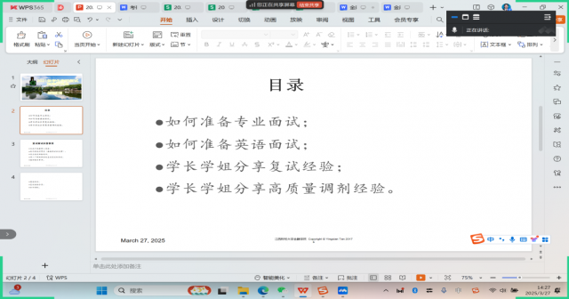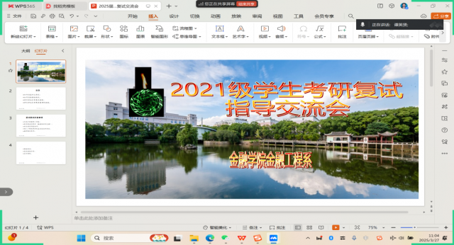 3月27日上午,金融学院成功举办了“2025年考研复试指导交流线上会”。本次活动由金融工程系组织,旨在帮助考研学子科学备战复试、提升面试能力。系主任谭英贤教授、系主任助理韩耀博士、2024届优秀毕业生吴文辉、宋璐瑶、李欣桐和40余名考研学生共同参与了此次交流分享会。
