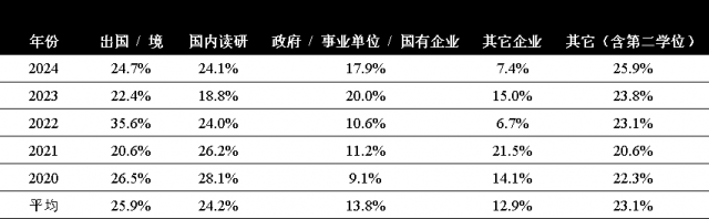 金融学(FRM方向)专业注重英语和数理基础的强化,五年数据看,出国留学和国内深造比例高,维持在50%上下。