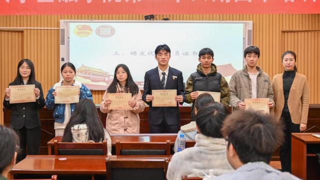结业仪式在国歌中拉开序幕。优秀小组代表何乔蕊、优秀学员代表饶嘉宇结合培训所学,分享了自身在角色认知、礼仪实践、工作方法等方面的成长与感悟。游志云为全体优秀学员颁发荣誉证书,以表彰他们在培训期间的优异表现。