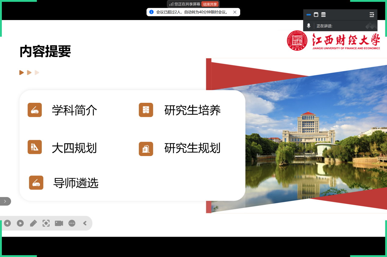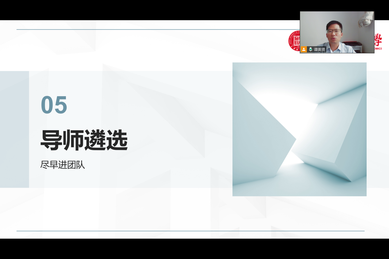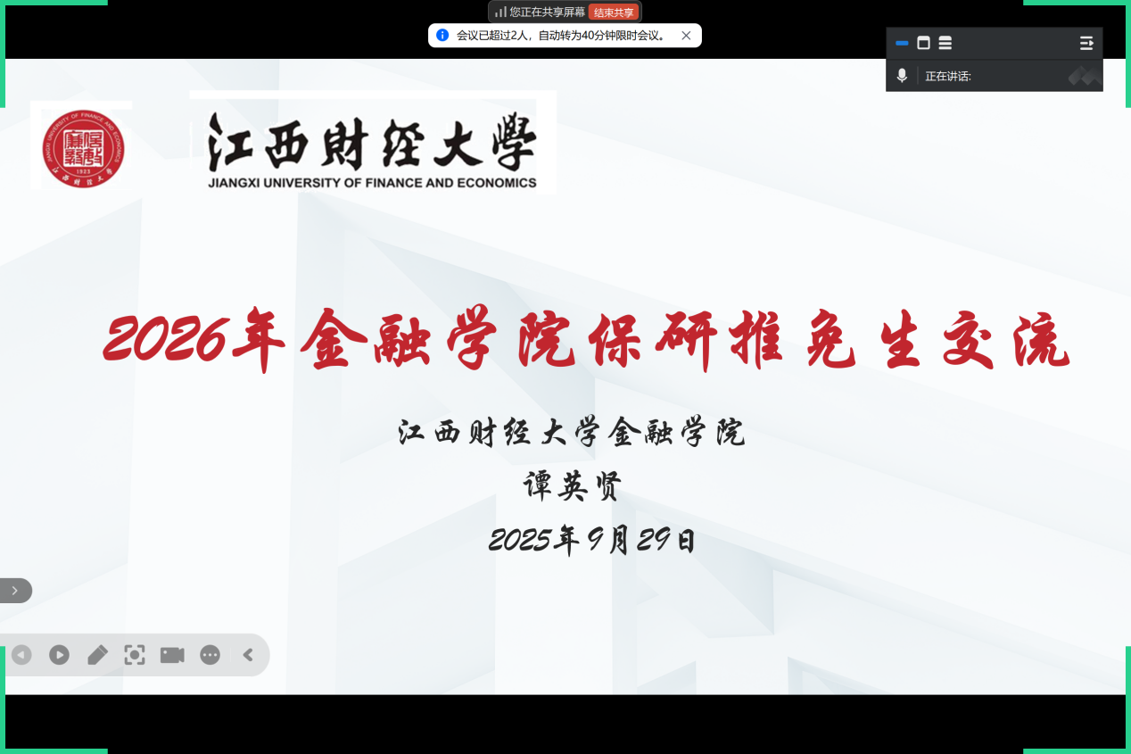 9月29日上午,金融学院通过依托腾讯会议平台,线上成功举办了“2026级保研推免生线上见面交流会”,会议由金融工程系主任谭英贤教授主持。会议围绕研究生阶段的学习科研规划、大四学年关键任务以及导师遴选流程等重要议题进行了深入讲解与交流,旨在帮助同学们2026级推免生提前明晰规划、做好准备、赢在起点。