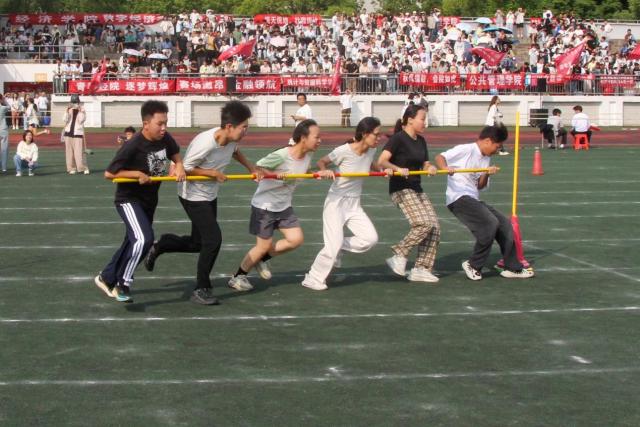 上午九点,发令枪响,战幕拉开。金融学院队员如离弦之箭般奔腾而出,六人一体,步伐铿锵。他们手持长杆疾速旋转,恰似彩色旋风席卷赛道,转弯处身形灵动如游龙,直道上步伐整齐似战鼓。看台上助威声震天动地,与赛场上矫健身影交相辉映,谱写出一曲激昂的青春战歌。
