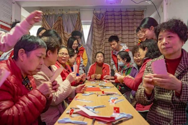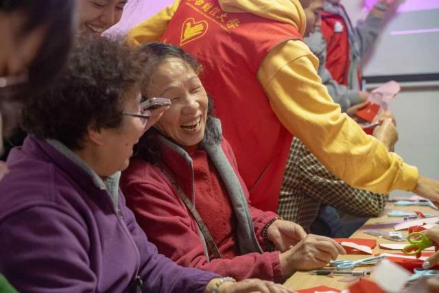 动手实践环节中,志愿者们采用“一对一”“一对二”的形式悉心陪伴,协助老人们完成描图、裁剪等步骤。志愿者们耐心地重复示范,对于理解稍慢的老人,更是倾注加倍的关怀。剪刀在红纸间穿梭,笑声在会议室里回荡。经过精心剪裁,一个个充满吉祥寓意的“福”字在手中诞生,成就感与幸福感在每张笑脸上绽放。