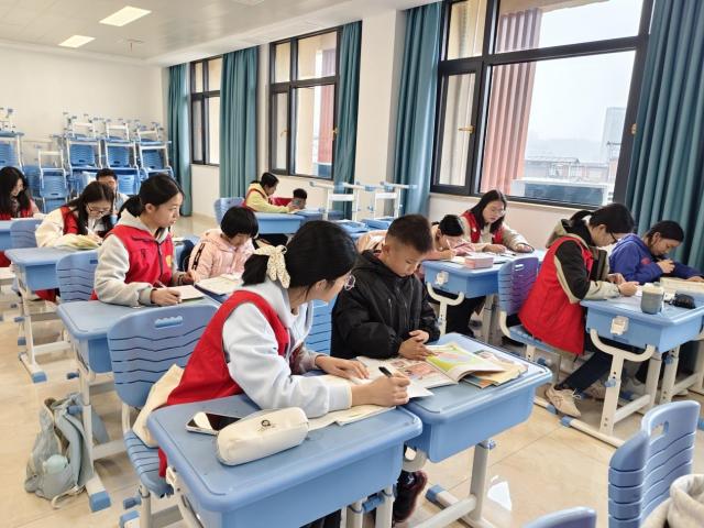 课间休憩期间,志愿者陪同孩子们走进图书室,围坐共读精彩段落,分享书中趣味情节。面对孩子们天马行空的提问,志愿者耐心解答,在轻松氛围中拉近彼此距离。书香陪伴成为课间最温暖的时光,也在孩子们心中播撒下阅读的种子。